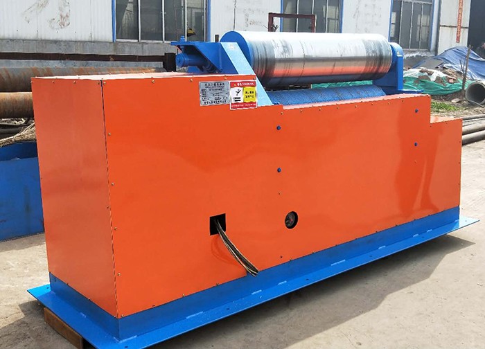 上辊压下由附电机经减速机带动蜗轮蜗杆、丝杠螺母副传递动力,使板材产生弯曲变形。卷制传动通过主电机经主减速机、开式齿轮带动下辊旋转,并成为卷板时的主要动力。上辊装置由上辊、上辊轴承座等组成。上辊两端轴承座安置滑动轴承。上辊升降用蜗轮蜗杆传动,压下装置由附电机提供动力,通过减速机、蜗轮蜗杆、丝杠螺母机械联动传递扭矩使上辊上下移动。下辊装置由下辊、下辊轴承座、下辊齿轮及滑动轴承等组成。下辊为主动辊,通过主传动减速机输出轴上的齿轮带动下辊齿轮传动扭矩至下辊。主要由反倒手柄、倒头体、活动铰链等组成,翻倒装置功能是方便成品取出。