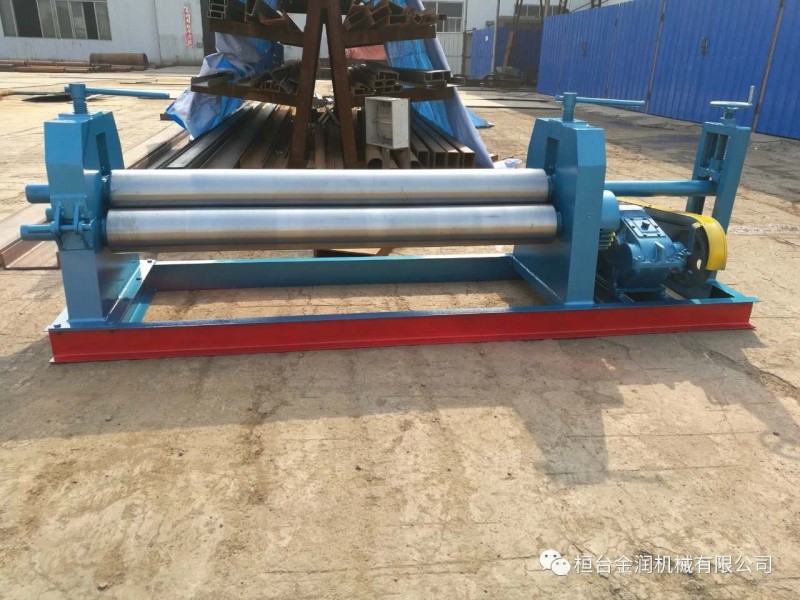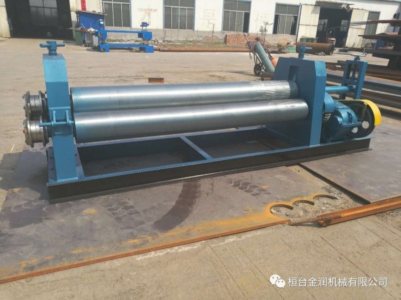 半自动草莓视频APP下载安装,该机结构式为三辊对称式,上辊在两下辊中间对称位置作垂直升降运动,通过人工拧动丝杆使上辊垂直升降,两下辊作旋转运动,通过减速机的输出齿轮与下辊齿轮啮合,为卷制板材提供扭矩。上辊可分离取料手动升降起辊。